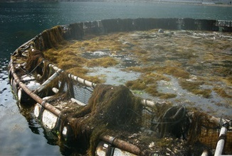 そこで東京湾、千葉側に位置する鋸南町勝山漁協地先で育つアカモクを(アカモクは12月から1月にかけ成長)、1m位成長したところで、我々専門家が選別、刈り取りを行い、これを漁協で沖だしした生け簀でロープに刺し込み生育させます。
